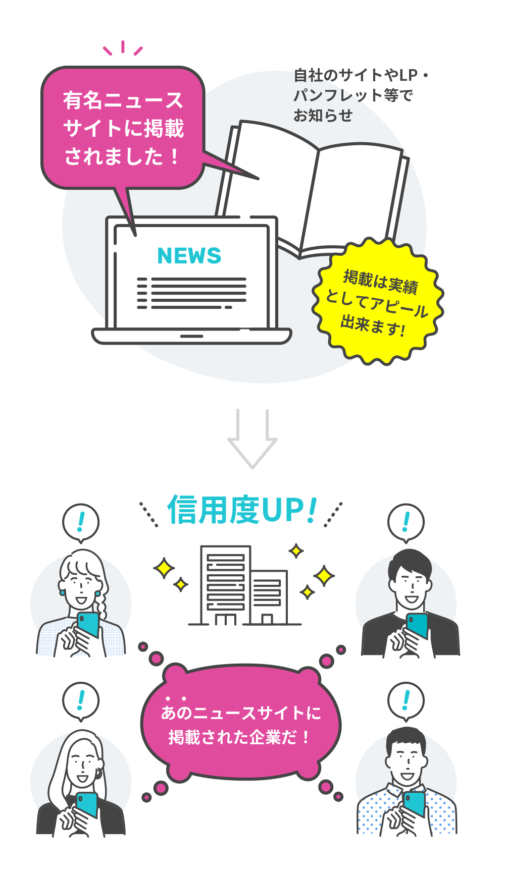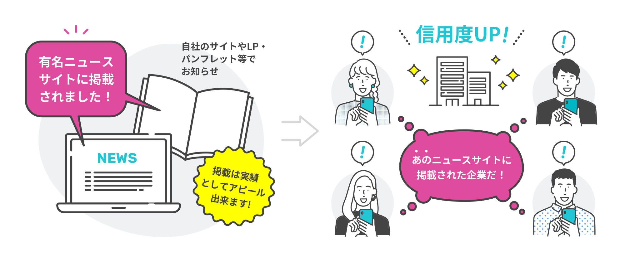 一度ニュースサイトに記事が掲載されると、拡散されて宣伝効果が相乗されることも見込まれます。時間と費用のかかる営業・広告に代わって有効的な宣伝効果が見込まれます。