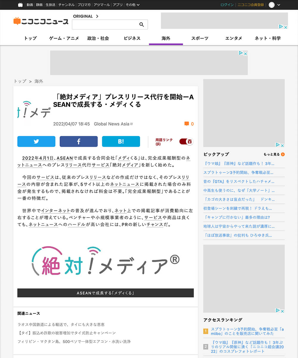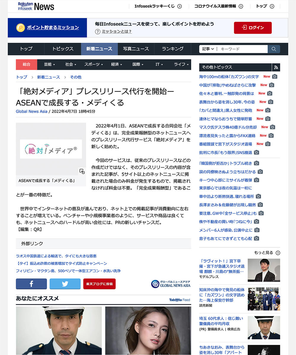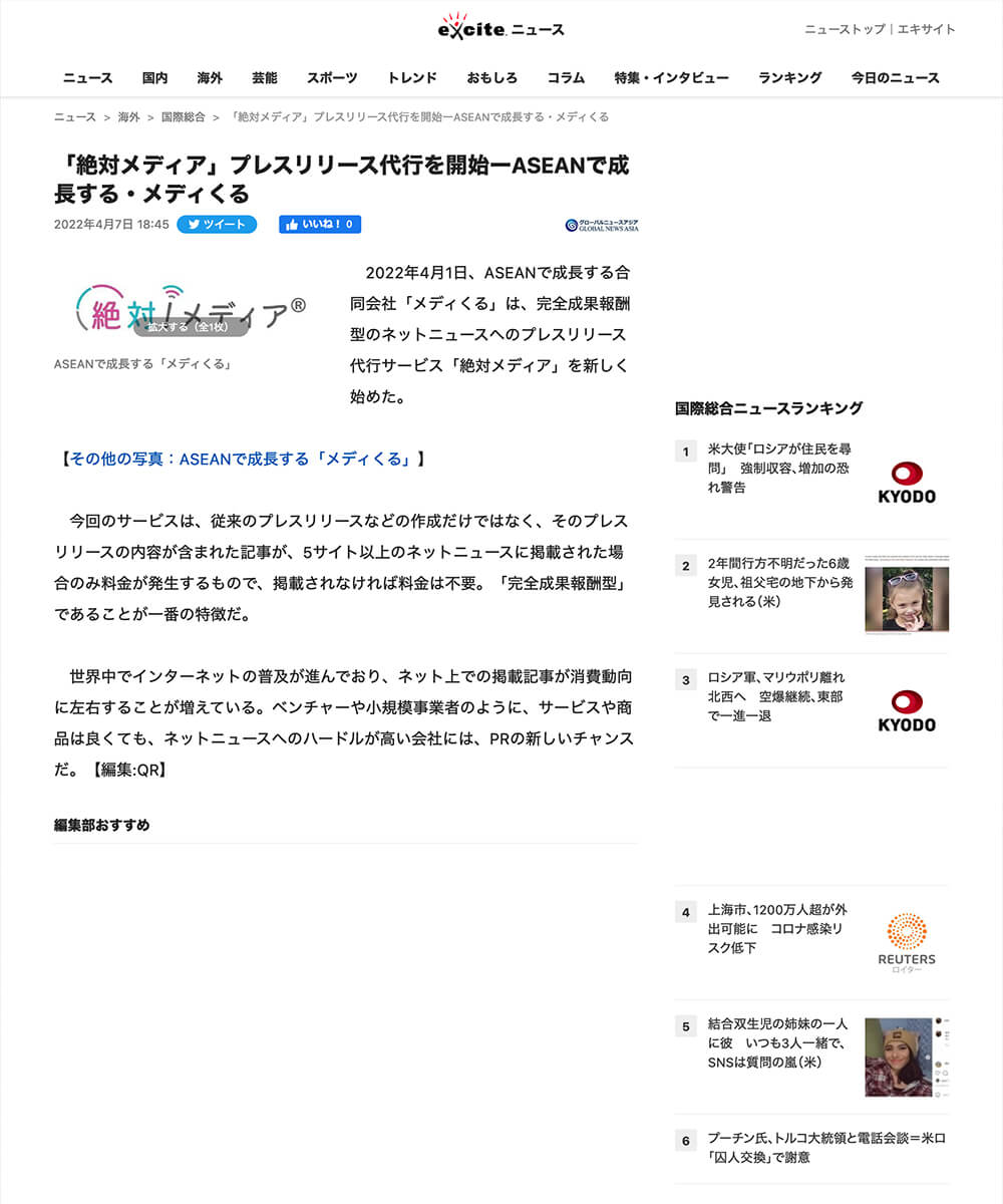 従来のプレスリリースのような自社発信ではなく、大手メディアから取り上げられた記事内容となります。